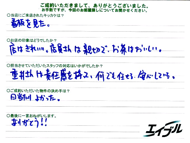 担当の方が、がんばって、希望の物件をおさえてくれたから。